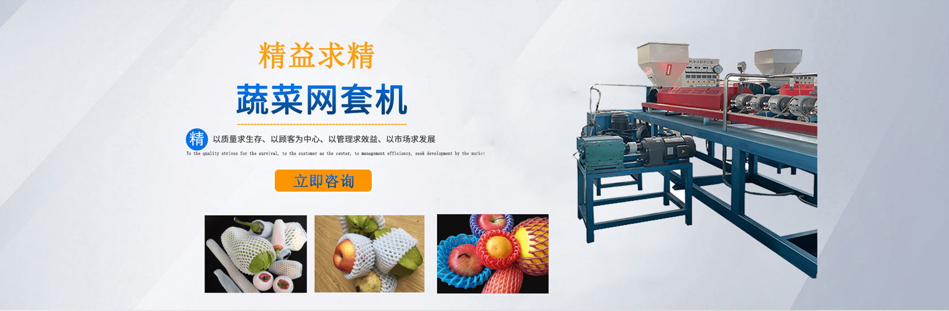 本公司創(chuàng)建于2002年,是一家集研發(fā)、加工、制作為一體,專門制作水果、蔬菜、玻璃器皿等發(fā)泡軟包裝設(shè)備的生產(chǎn)廠家。公司擁有眾多專業(yè)骨干人員,技術(shù)力量雄厚,可提供全套的售前及售后一條龍全方位服務(wù)。公司主營EPE發(fā)泡網(wǎng)套機(jī)、EPE發(fā)泡棒自動化設(shè)備。是深受業(yè)界好評的網(wǎng)套機(jī)生產(chǎn)廠家,我廠生產(chǎn)的網(wǎng)套機(jī)價格合理,歡迎新老客戶前臺詢價!